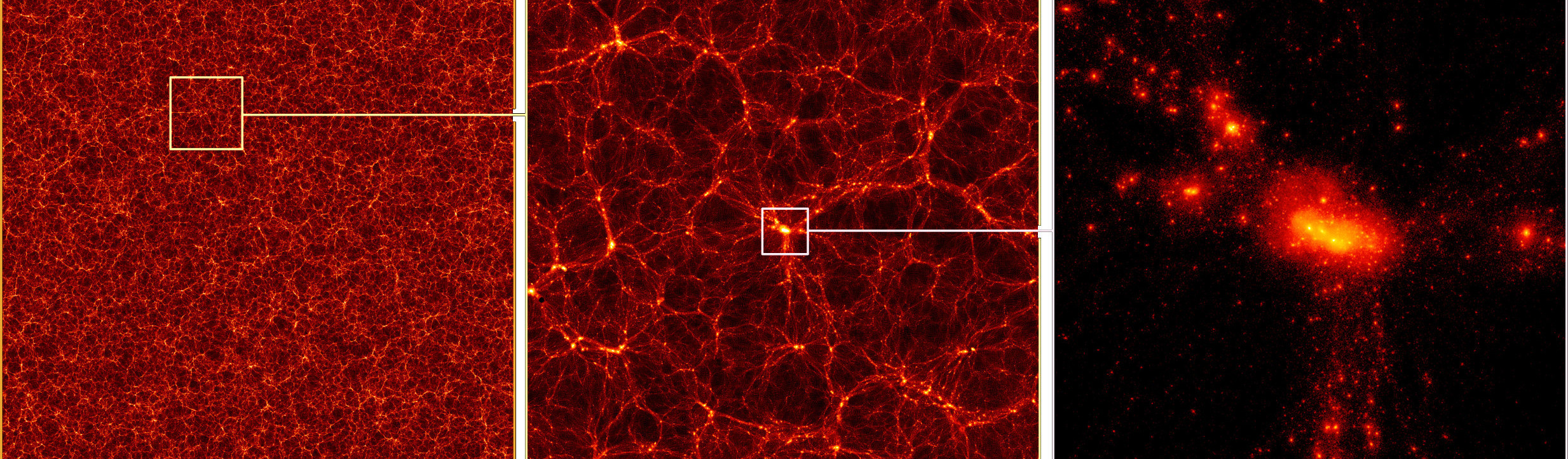 Large-scale galaxy maps as the one shown in Fig. 2 however reveal only a small part of the Cosmic Web: its luminous mass component. The Cosmic Web has a pronounced “dark side”, a component of dark matter that shares the same web-like geometric shape. Dark matter, an exotic substance not made from ordinary atoms, cannot be seen using telescopes, as it does not interact electromagnetically. Still, it can be made visible through gravity, as its presence affects the motion of stars, galaxies and even the paths of light rays (a phenomenon known as gravitational lensing). Systematic mass measurement techniques require the presence of dark matter in large amounts, and allow to map both its amount and spatial distribution. These methods find that dark matter forms extended clumps, so-called halos, embedding the visible stars and galaxies. Combining several independent observations implies that more than 85 percent of the matter in the universe is dark, hugely dominating gravitationally over the luminous matter. In fact, the gravity of dark matter keeps galaxies and clusters together in the first place, as without it, these systems would simply disperse on timescales around a billion years. Moreover, the luminous matter distribution turns out to closely follow that of dark matter for the same reason, at least on Cosmic Web scales. Thus we see galaxies in filaments or clusters only because dark matter has formed these structures, while the luminous matter simply follows dark matter’s gravitational attraction.