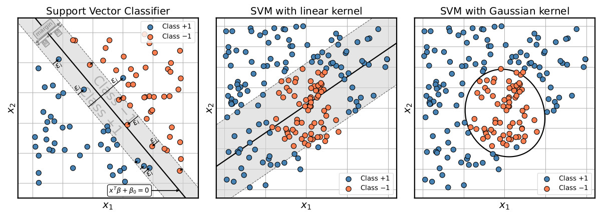 where $\alpha_i$ is only non-zero for training instances that either lie directly on the margin or violate it (the so-called support vectors). The SVM uses this property to perform the transformation to a higher dimensional space only implicitly by means of the kernel trick, substituting the inner product by a kernel function $K(\mathbf{x}, \mathbf{x}_i)$. This is not only computationally efficient, but also allows transformations to infinite dimensional spaces when employing for instance a Gaussian kernel. With this approach the SVM (with the right kernel) can tackle even complex non-linear problems, where the basic SVC fails (see right panel in Fig. 2).