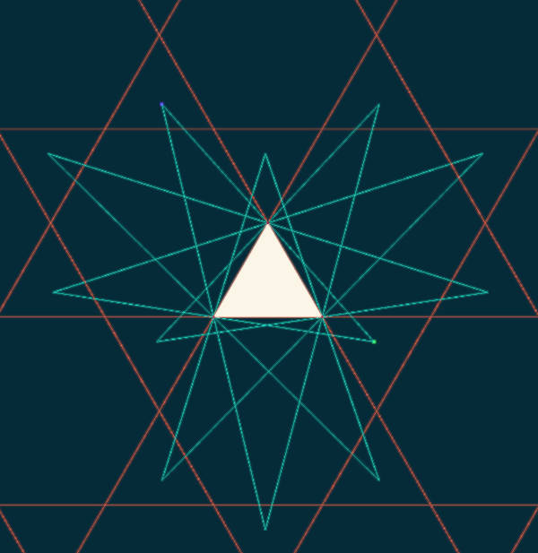 But as we vary the length parameter, we might occasionally notice a striking regularity in the image. For a few very precisely chosen side lengths, the image simplifies dramatically. In fact, for any integer $k\geq 7$, we can compute a side length $\ell(k)$ with the following special property. The singularity set of a triangle with side length $\ell(k)$ looks exactly like a tiling of the plane by triangles and $k$-sided polygons, with two copies of each shape meeting at each vertex in alternating order. This result holds for all integers $n,k\geq 3$ such that $1/n+1/k < 1/2$. This tells us that in hyperbolic geometry, there is an infinite number of different regular polygonal table shapes for which all trajectories are periodic, instead of the three we know about in the Euclidean plane. For more on these tilings in general (i.e., not in the context of billiards), see Wikipedia.