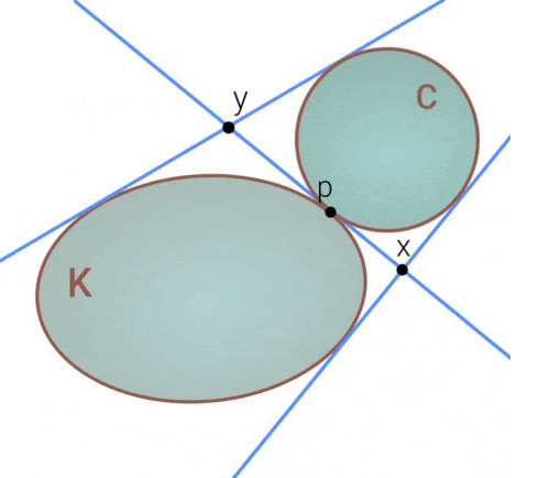 This circle actually shares three tangent lines with our table, two of which are already drawn. Construct the third to obtain the new point y, which is defined to be the intersection of the tangent line through p with the third tangent line. This game is provisionally called outer billiards with length for reasons beyond the scope of this post, and has only recently been described by Sergei Tabachnikov at Penn State and Peter Albers from STRUCTURES at Heidelberg University.