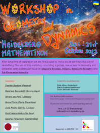 We are happy to announce that registration is open for the Workshop in Geometry and Dynamics, which is going to take place on October 20th and 21st at Mathematikon in Heidelberg. The aim of this workshop is to bring together researchers in geometry and dynamics with a particular focus on magnetic dynamics, billiards, symplectic geometry and sub-Riemannian geometry.